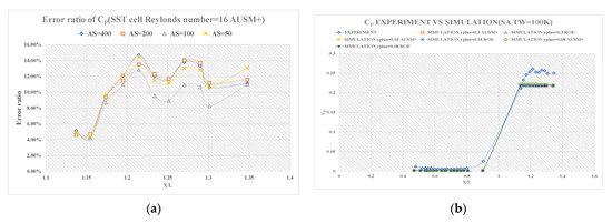 Figure 13b is a comparison of the wall pressure coefficient distribution from the experiment and the simulation adopting the Spalart-Allmaras model at = 100 K. The overall distribution trend of the simulation data matched well with the experiment data and the simulation results were very close to the experiment data at the upper stream of the wedge section. The error ratio distribution of the numerical data with the experiment data at the wedge section is displayed in Figure 14a. The results based on a cell Reynolds number of 8 and the AUSM+ flux type were the closest to the experimental data and the average error ratio was about 11.18%. The aspect ratios 400, 200, 100, and 50 were adopted; Figure 14b shows the distribution diagram of the error ratio of the pressure coefficient. As the aspect ratio decreased, the error ratio decreased. When the aspect ratio was equal to 200, the optimal simulation results could be obtained, and the mean error, error variance, and mean error ratio were 0.027, 8.95 × 10−5, and 10.9%, respectively. Subsequently, as the aspect ratio decreased, the error ratio increased.