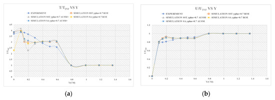 (a) ratio distribution diagrams between T and TINF at S = 0.105 m; (b) ratio distribution diagrams between U and UINF at S = 0.105 m.