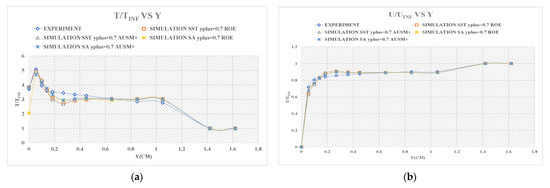 (a) ratio distribution diagrams between T and TINF at S = 0.055 m; (b) ratio distribution diagrams between U and UINF at S = 0.055 m.
