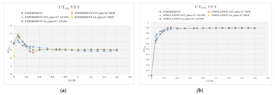 (a) ratio distribution diagrams between T and TINF at S = 0.155 m; (b) ratio distribution diagrams between U and UINF at S = 0.155 m.