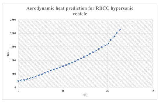 Figure 27 presents the aerodynamic heat of the RBCC scramjet-propelled vehicle in the flight path, as shown in Figure 1b. During the ejection phase, which lasted for about 10 s, the vehicle rose from 11 km to 16 km in altitude, the velocity accelerated from 0.8 Ma to 3 Ma, and the aerodynamic heat increased from an initial temperature of 216.65 K (−56.35 °C) to 543 K (270 °C), with a temperature change of 326.35 °C and an average temperature change rate of 32.635 °C/s. During the sub-combustion stamping stage, which lasted for about 20 s, the vehicle rose from 16 km to 26 km in altitude, the velocity accelerated from 3 Ma to 6 Ma, and the aerodynamic heat increased from a temperature of 543 K (270 °C) to 1550 K (1277 °C), with a temperature change of 1007 °C and an average temperature change rate of 50.35 °C/s. During the super-combustion stamping stage, which lasted for about 4 s, the vehicle rose from 26 km to 30 km in altitude, the velocity accelerated from 6 Ma to 6.5 Ma, and the aerodynamics heat increased from a temperature of 1550 K (1277 °C) to 2010 K (1737 °C), with a temperature change of 460 °C and an average temperature change rate of 115 °C/s. During the cruising phase, the vehicle maintained a constant speed and altitude of 6.5 Ma and 30 km, and the aerodynamic heat finally increased to 2130 K (1857 °C). With the increase of velocity, the average temperature change rate also increased. During a flight time of about 34 s, the aerodynamic heat increased from 216.65 K to 2130 K, and the temperature change reached about 1913.35 °C, which was consistent with the descriptions in Refs. [33,34,35], and the maximum average temperature change rate reached 115 °C/s. The RBCC hypersonic vehicle experienced severe aerodynamic thermal problems during the flight.