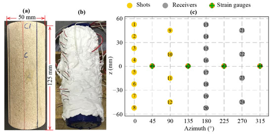 (a) Rock sample; (b) the sample coated with silicone sealant; (c) cylindrical expansion view of the installation position of transducers and strain gauges.