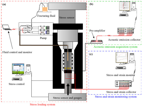 The experimental system consisted of the stress-loading system (Figure 2a, the maximum load was 2000 tons), the acoustic emission acquisition system (Figure 2b, the maximum sampling rate was 100 MHz, this experiment used 25 MHz), and the stress and strain monitoring system (Figure 2c, the resolution was 16 bit).