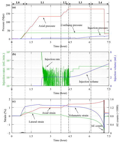 As shown in Figure 3, the experiment lasted 7.5 h and could be roughly divided into five stages: hydrostatic loading stage (L0), water-saturation stage (L1), axial loading stage (L2), hydraulic fracturing stage (L3), and rock fracture stage (L4). In the L0 stage, the axial (Pa) and confining pressure (Pc) were simultaneously increased to 35 MPa at a loading rate of 2 MPa/min. At the L1 stage, we kept Pc at 35 MPa and increased the axial pressure to 132 MPa at a loading rate of 2 MPa/min. Then, distilled water was injected into the borehole continually. About half an hour later, the water injection pressure (Pin) reached 4.7 MPa, and the flow rate was stabilized at 0.001 mL/min. In the L2 stage, we kept Pc and Pin constant and increased Pa to 176 MPa (65% of the strength of dry rock under the same confining pressure). In the L3 stage, we kept Pa and Pc constant, and water was injected into the sample gradually. After about half an hour, the flow rate was stabilized at 0.02 mL/min, and after about 100 min, the water pressure was increased to 16.25 MPa. In the L4 stage, the water injection pressure began to decline slowly, and about 13 min later, the water injection pressure and axial pressure suddenly decreased rapidly, and the rock ruptured. Finally, axial loading stopped automatically.