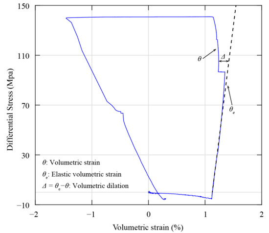 The temporal variations in axial (), lateral (), and volumetric strain () are shown in Figure 3c. In the L0 stage, the sample was compacted rapidly due to the isotropic stress. At the beginning of the L1 stage, the sample exhibited elastic deformation. With the increase in differential stress, the sample gradually deviated from elasticity (Figure 4). The deviation from elastic strain (dotted line in Figure 4) represents the inelastic increase in rock volume (), which is called volumetric dilation. At the L3 and L4 stages, the water injection further promoted volumetric dilation (Figure 5b).