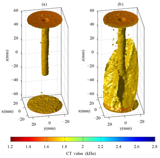 The internal structure of the sample was obtained using medical CT scanning equipment (Toshiba Aquilion ONE TSX 301A, Tokyo, Japan) before and after the experiment. The scanning voltage was 135 kV, slice thickness was 0.5 mm, the sampling interval was 0.106 mm, and the pixel grid was 512 × 512.