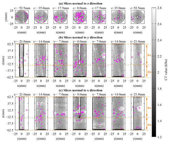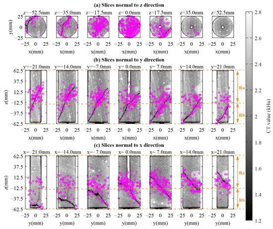 As shown in Figure 3c, two peaks of AE activity were observed in the L0 and L4 stages, respectively. The first peak was initiated at a low-stress level. Compared with the X-ray CT scan images of rock before the experiment (Figure 7), the locations of these acoustic emission events were randomly distributed inside the sample. However, the increasing volumetric strain indicated that the rock was undergoing more volume compaction than solid elasticity. This behavior is attributed to the closing of preexisting cracks [61]. Hence, it can be considered that the first peak of the AE activity in this stage was mainly caused by the closure of natural microcracks. Under high differential stress, the second AE peak was initiated when the injection pressure approached 75% of its peak. From Figure 8, we can see that the second AE activity was clustered around the fracture surface. Additionally, more clusters can be observed at Ra, but the fewer clusters at Rb have a narrower offset range along the fracture surface.