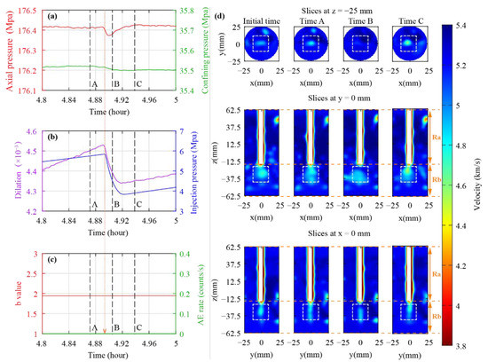 In phase H0, the axial and confining pressure remained constant, and the pore pressure gradually increased. The rock dilation gradually increased and the velocities slowly decreased (Figure 5c). It is worth noting that the water injection pressure suddenly dropped by 2 Mpa when it reached 5.84 MPa. However, no obvious acoustic emission events were recorded at this time, and no significant changes were observed in velocities. The evolution of axial pressure, confining pressure, and dilation demonstrated that all of these decreased slightly before the decrease in the injection pressure (Figure 9a,b). Three-dimensional UT images (Figure 9d) show that an obvious low-velocity zone was below the borehole (shown by the white dotted line box) at the initial time. This indicates that there may have been defects or microcracks below the borehole. Nevertheless, with the increasing pore pressure, the velocities in this area increased at Time B but dropped again at Time C.