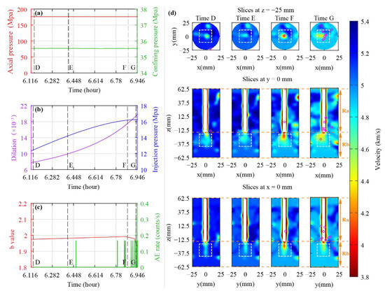 Mechanical response and velocity images of rock before water injection pressure reached peak value in H1 phase: (a) axial (red line) and confining pressure (green line); (b) dilation (purple line) and water injection pressure (blue line); (c) b-value (red line) and AE rate (green line); (d) slices of the 3D ultrasonic velocity images at different times (Times D~G, respectively, correspond to the times marked by the black dotted lines in the left subfigures, and the magenta circles represent the positions of acoustic emission events occurring before the corresponding times). The orange dotted line in the subfigure (d) represents the boundary between region Ra and Rb. The white dotted line box represents the low-velocity zone below the borehole.