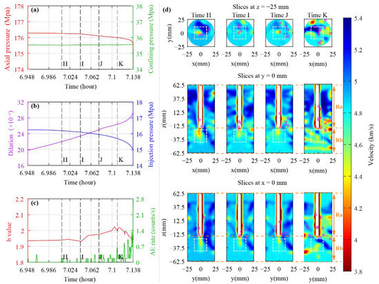 In Phase H1-2, accelerated energy release caused the decline in the axial pressure and pore pressure (Figure 11). Injection-induced stress variation was reflected by the b-value (Times H~K). Increasing AE activity and dilation demonstrated that the generation of the microcracks was accelerating. From the UT images, we can see that the velocity in the Ra region was higher than that in Rb. This can be explained as the higher water saturation in Ra than Rb. Interestingly, although the velocity declined overall in the sample, the velocity drop in the Ra region was suppressed so much as its velocity increased obviously at Time K. Together with the mechanical response in this phase, we believe that “dilation hardening” started. Besides, the local low-velocity zone and its suppressed velocity drop could still be observed below the bottom of the borehole.