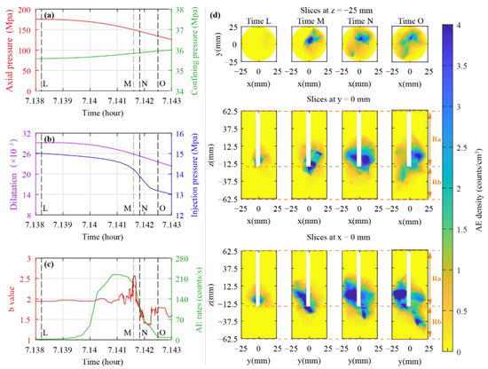 Mechanical response and acoustic emission density images of rock in H2 phase: (a) axial (red line) and confining pressure (green line); (b) dilation (purple line) and water injection pressure (blue line); (c) b-value (red line) and AE rate (green line); (d) slices of the 3D AE density images at different times (Times L~O correspond to the time points marked by black dotted lines in the left subfigures). The orange dotted line in subfigures (d) represents the boundary between region Ra and Rb.