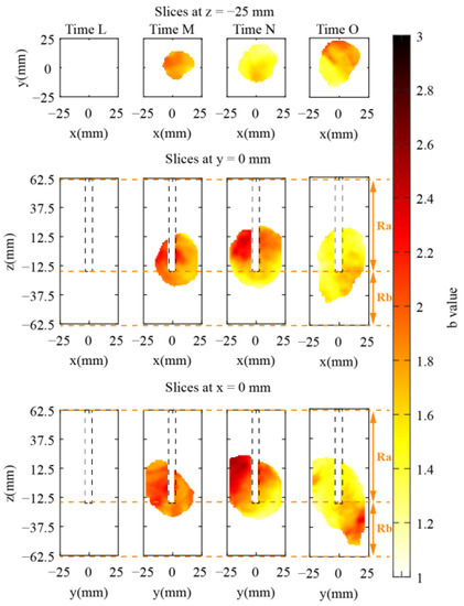 where Amax is the maximum amplitude of the AE signal, A0 is the threshold for detection, and M0 = −11 is a calibration parameter to roughly estimate the absolute AE magnitude. Based on the AE data recorded, the maximum likelihood method was used to estimate the frequency magnitude distribution. The temporal changes in b-values were calculated for a running window of a constant AE number n = 500. According to the overall AE activity in a specific time window, we calculated the b-values for the n (≥50) closest AEs to each voxel within a maximum radius of Rmax = 25 mm. The b-map is beneficial for explaining stress redistribution during the fracture.