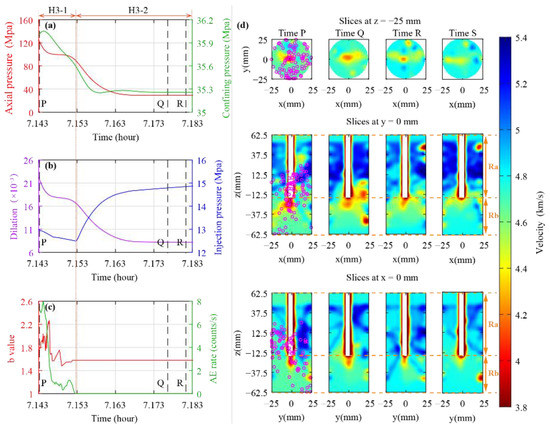Phase H3 can be divided into two subphases: H3-1 and H3-2 (Figure 14). In phase H3-1, Pa, Pin, and Δ decreased slightly before the confining pressure dropped to 35.6 Mpa. After the AE rate reached its second peak, the b-value increased from 1.36 to 2.27. Interestingly, a peak of b-value was observed before the third peak of the AE rate. As shown in the UT images in Figure 14d, an obvious low-velocity zone was below the borehole at Time P. In fact, this zone corresponds to the macroscopic shear fracture. In the phase H3-2, Pa, Pc, and Δ dropped to a constant, but Pin increased to a constant. Meanwhile, AE activity calmed down, and the velocity inside the rock, especially near the macro shear zone, gradually rose (Times Q~S).
