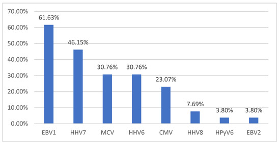 A total of 23/26 (88.5%) patients were positive for one or more viruses. In total, we detected as positive samples: 16 (61.63%) EBV1, 12 (46.15%) HHV7, 8 (30.76%) MCV and HHV6, 6 (23.07%) CMV, 2 (7.69%) HHV8, 1 (3.8%) HPyV6 and EBV2 (Figure 1). We detected tumors with unique viral infections (six), with double infections (four), with triple viral infections (eight) and four tumors were positive for DNA of four of these viruses.