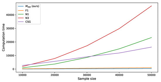 Figure 3 and Table 5 show how computation time changes for various sample sizes. Our measure was on average 2.8 times faster than , 47.0 times faster than , 94.5 times faster than , and 41.6 times faster than . and show extremely increasing computation time with respect to the sample size, which is not suitable for large-scale high-dimensional datasets.