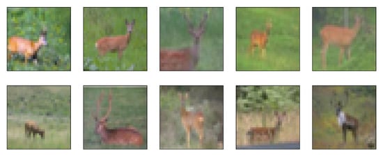 Ten similar selected images in the deer class on degraded-CIFAR10. Images with high similarity were selected using cosine similarity.