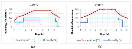 Temperature and humidity courses with the modifications (a) 180 °C; (b) 200 °C.