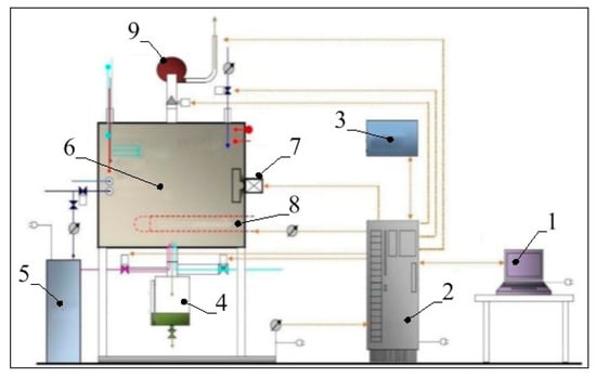 Modification chamber scheme: (1) PC; (2) switchboard; (3) measuring box; (4) condensate resorvoir; (5) steam generator; (6) thermal modification chamber; (7) fan; (8) heating element; (9) exhaust fan.