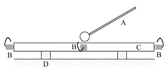 To test the dynamic properties, the sample was positioned on two flexible supports (free–free support condition). The points of support were located in the nodes (minimum amplitude) of the fundamental bending mode shape of vibration (at 0.224 and 0.776 of the sample length, which is in 100.8 and 349.2 mm length of the specimen) [,].