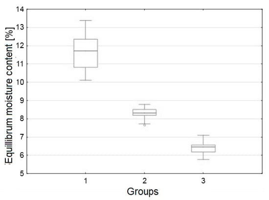 EMC of specimens: group no.1—unmodified specimens; group no.2—specimens modified at 180 °C; group no.3—specimens modified at 200 °C. EMC at 60% air humidity. °—outlier values.