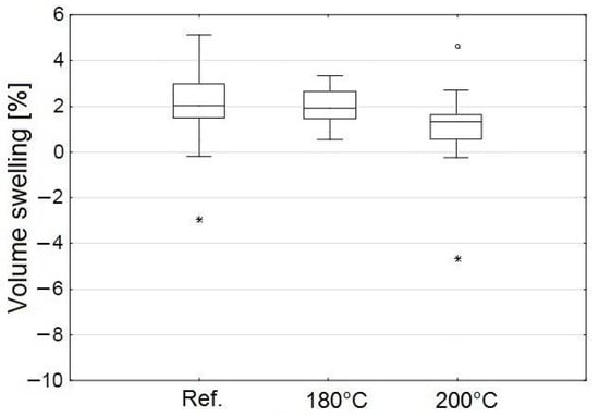Volume swelling in the following three groups of specimens: Ref. (unmodified), modified at 180 °C, and modified at 200 °C, *—outliers. °—outlier values; *—extreme values.