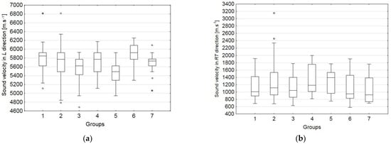 Sound velocity in longitudinal (a) and transversal (b) directions. Group description: (1) 20 °C 40% unmodified; (2) 20 °C 60% unmodified; (3) 20 °C 80% unmodified; (4) 20 °C 60% modified at 180 °C; (5) 20 °C 80% modified at 180 °C; (6) 20 °C 60% modified at 200 °C; (7) 20 °C 80% modified at 200 °C. °—outlier values; *—extreme values.