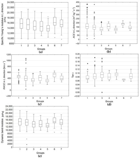 Distribution of acoustical properties in the specimens (group description is in Figure 7): (a) specific Young modulus; (b) acoustic conversion efficiency (ACEL); (c) relative acoustic conversion efficiency(RACEL); (d) damping coefficient tan δ; (e) dynamic bend modulus. °—outlier values; *—extreme values.