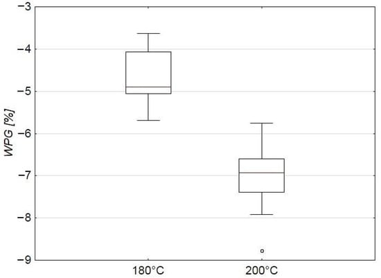 Weight loss was detected after the thermal modification, and the referenced and modified specimens were compared. The result was an average weight loss of 4.7 and 7% after modification at 180 and 200 °C, respectively. This loss is captured in Figure 8. Alén et al. [] found weight loss 1.5% at 180 °C and 12.5% at 225 °C treatment of spruce wood. Zaman et al. [] determined a values of weight loss from 5.7 to 7.0% for pine wood treatment at temperature 205 °C. The weight loss is due to chemical changes in the wood. Hemicelluloses are reduced due to their thermal instability [,]. The higher modification temperature is used, the higher is reduction of weight [,,,].