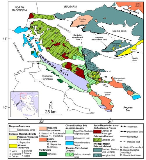 Simplified geological map of the Serbo-Macedonian Massif in northern Greece. The adjacent Kerdylion Unit and the Circum-Rhodope Belt are also shown (modified after [6,16,17]).