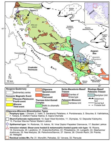 The SMMP and Rhodope metallogenic provinces contain several ore deposits and prospects of Cenozoic age [5,6,8,34,35,36,37]. According to Kockel et al. [19], 48 ore deposits (e.g., porphyry, epithermal and replacement types) occur in the Vertiskos Unit and the adjacent Kerdylion Unit that are genetically associated with the Oligocene-Miocene magmatism (Figure 2). These deposits and prospects occur mainly in the Kilkis ore district to the north and in the Kassandra district (NE Chalkidiki) to the south [6,19,20,38,39].