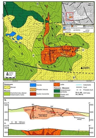 Ore mineralization at the Vathi porphyry system is hosted by quartz monzonite, latite, phreatic breccia, and surrounding metamorphic rocks. At the surface, the metallic mineralization is almost totally oxidized. The oxidation zone has a maximum depth of 90 to 100 m and is associated with a narrow secondary enrichment zone, 2 m deep [46] (Figure 3c). The hypogene mineralization at the surface is restricted to the quartz monzonite, and in the drill core samples, it is well exposed below the secondary enrichment zone to an unknown depth.
