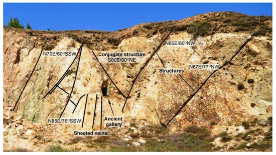 Along the northern part of Ragian 1 Hill, a group of structures is present that trends E-W, which is accompanied by several minor conjugate NE-SW structures (Figure 3). Locally, along these E-trending structures, in the latite, a cataclasite is found. Veins, in places as sheeted veins, are associated with the E- and NE-trending group of structures and dip 60° to 76° toward SSW. They occur on the northeastern side of Ragian 1 Hill (Figure 3 and Figure 4). At this site, an ancient gallery, approximately 1 m wide, was opened along these veins possibly for gold and/or copper exploitation (Figure 4).