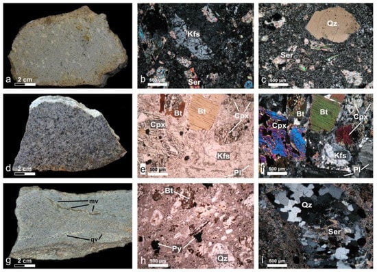 Hand specimens of rock samples and photomicrographs showing typical mineralogical paragenesis and alteration textures (plane polarized light: e, h; cross-polarized light: b, c, f, i) of the latite (a–c) and the quartz monzonite (d–i) from Vathi: (a) Fine-grained latite exhibiting a porphyritic texture with K-feldspar phenocrysts; (b) Magmatic K-feldspar (Kfs) altered to sericite (Ser) in a medium-grained ground mass composed of sericite and quartz; (c) Quartz (Qz) and sericite (Ser) in a fine-grained ground mass composed of sericite and quartz; (d) Equigranular quartz monzonite; (e,f) Magmatic clinopyroxene (Cpx), biotite (Bt) and K-feldspar (Kfs); (g) Mineralized veinlets (mv) comprising mainly pyrite and barren quartz veinlets (qv) crosscutting the quartz monzonite; (h) Magmatic biotite (Bt) and quartz (Qz) with disseminated pyrite (Py); (i) Quartz (Qz) vein with sericite (Ser) crosscutting the quartz monzonite.
