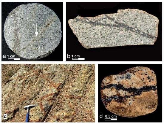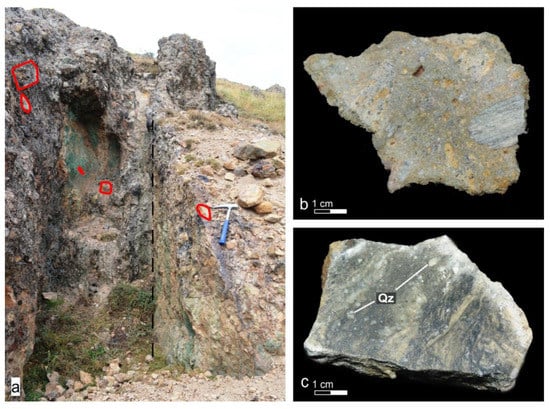 Pyrite and chalcopyrite, as well as minor amounts of rutile and ilmenite, occur in sericitic alteration mainly in latite but also in the phreatic breccia and surrounding metamorphic rocks [46]. The mineralization forms disseminations, aggregates, and D-type veins and veinlets and associated halos along cracks in the latite rock mass (Figure 12c). In some cases, D-type sheeted veins trending E-W form a dense system crosscutting the latite (Figure 6). They are usually less than 1 cm wide, locally reaching up to 5 cm in width.A subsequent epithermal overprint is documented locally within the potassic and sericitic alteration. It mainly occurs as E-type veins at depth and consists of sphalerite, galena, arsenopyrite, pyrrhotite, and traces of tennantite, stibnite, rutile, and ilmenite.