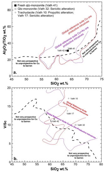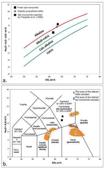 The compositions of 15 samples of latite, three samples of quartz monzonite, and single samples of supergene mineralization, phreatic breccia, and cataclasite are shown in Table 1 and Table 2. Due to the localized but extensive hydrothermal alteration of the magmatic rocks, the geochemical affinity and the classification were based on carefully selected fresh or least propylitized samples. Samples Vath 41 (quartz monzonite) and Vath 42 (latite; slightly propylitized), as well as unaltered quartz monzonite sample reported by Filippidis et al. [45] were evaluated (Figure 7a,b).