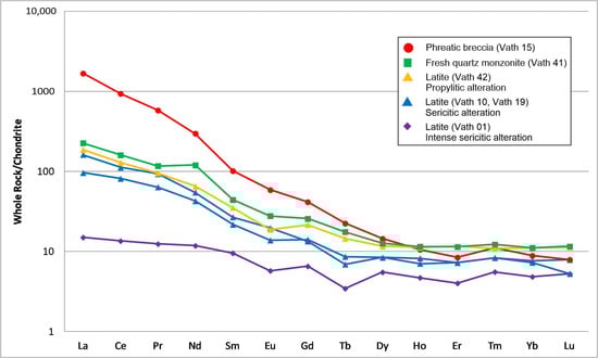 Chondrite-normalized rare earth elements (REEs) for the Vathi magmatic rocks show REE enrichment with a relatively flat heavy REE pattern (Table 2; Figure 8). The latite (Vath 42), quartz monzonite (Vath 41), and the phreatic breccia (Vath 15) possess ΣREE contents of 279.16, 370.46, and 1851.25 ppm, respectively. Quartz monzonite and latite samples appear 10 to 100 times more enriched in REΕs compared to chondrite, whereas the phreatic breccia sample is significantly more enriched in LREEs, especially La (613.1 ppm) and Ce (894 ppm).