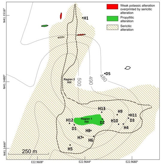 Spatial distribution of the hydrothermal alterations of the Vathi porphyry system. The locations of the drill holes are also shown (advice Figure 3).
