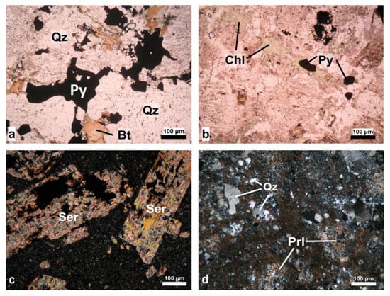 Photomicrographs of textures and minerals of the hydrothermal alterations (plane polarized light: a, b; cross-polarized light: c, d): (a) Hydrothermal biotite (Bt), quartz (Qz), and pyrite (Py) from an A-type veinlet of the potassic alteration in a quartz monzonite drill core sample; (b) Hydrothermal chlorite (Chl) and pyrite (Py) of the propylitic alteration in the quartz monzonite; (c) Sericite (Ser) in altered K-feldspar of the sericitic alteration in latite; (d) Clusters and disseminations of quartz (Qz) and pyrophyllite (Prl) replaced by iron oxides in the groundmass of cataclasite.
