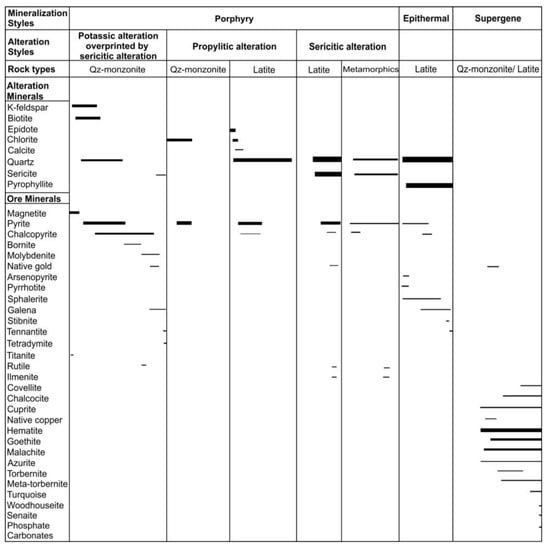 Ore and alteration minerals corresponding to each alteration zone in the Vathi porphyry Cu-Au±(Mo) deposit. Line thickness depicts the relative abundances of the minerals. Qz: quartz.