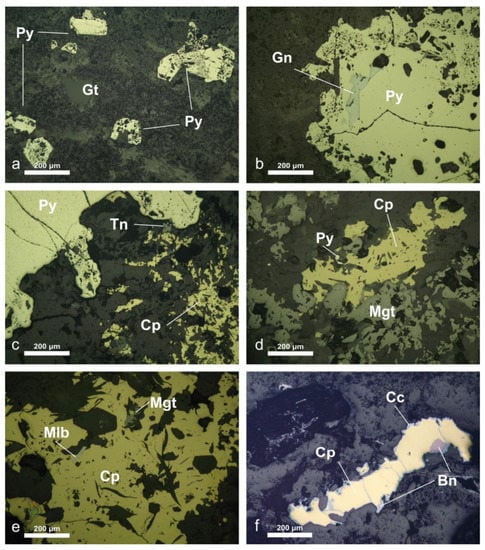 Photomicrographs of the hypogene mineralization in quartz monzonite (a,b) and latite (c–f) (plane reflected light: a–f: (a) Disseminated euhedral pyrite (Py) and goethite (Gt); (b) Galena (Gn) filling interstices in pyrite (Py); (c) Corroded pyrite (Py) and chalcopyrite (Cp) with minor tennantite (Tn); (d) Magnetite (Mgt) intergrown with chalcopyrite (Cp) and pyrite (Py); (e) Magnetite (Mgt) in chalcopyrite (Cp) and molybdenite (Mlb); (f) Chalcopyrite (Cp) and bornite (Bn) replaced by chalcocite (Cc).