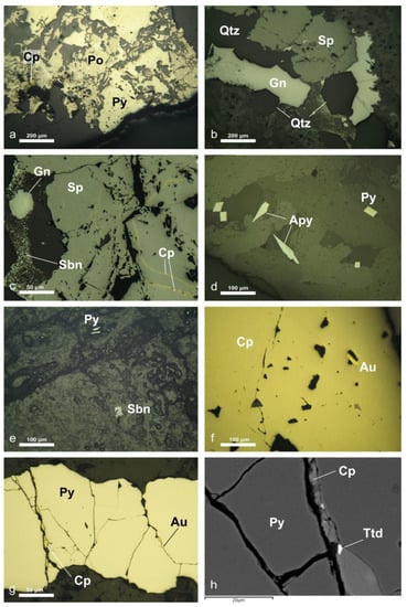 Photomicrographs of the hypogene mineralization in latite (a–e) and quartz monzonite (f,g) (plane reflected light: a–g), and an SEM back-scattered electron image (h) of a pyrite veinlet in the quartz monzonite: (a) Pyrrhotite (Po) is intergrown with pyrite (Py) and chalcopyrite (Cp) in an E-type epithermal vein; (b) Sphalerite (Sp), galena (Gn), and quartz (Qtz) in an E-type epithermal vein; (c) Sphalerite (Sp), galena (Gn), and stibnite (Sbn) inclusions of chalcopyrite (Cp) in an E-type epithermal vein; (d) Euhedral arsenopyrite (Apy) and pyrite (Py) in micro-cavities in the latite; (e) Stibnite (Sbn) and pyrite (Py) relicts in goethite; (f) Chalcopyrite (Cp) with an inclusion of native gold (Au); (g) D-type pyrite (Py) veinlet with chalcopyrite (Cp) and native gold (Au) in micro-cracks; (h) Chalcopyrite (Cp) and tetradymite (Ttd) filling micro-cracks in pyrite (Py).