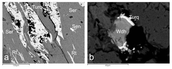 SEM back-scattered electron images of secondary minerals from the oxidation zone: (a) Τurquoise (Turq), senaite (Sen), and rutile (Rt) along the cleavage of sericite (Ser); (b) Woodhouseite (Wdh) and turquoise (Turq) in a cavity in latite.