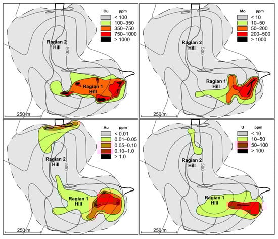 The studied mineralization (N41.1458°, E22.9639°) is located northwest of the Vathi village in the Kilkis area and spans two hills, Ragian 1 Hill and Ragian 2 Hill (Figure 3a). Surface geological mapping and sampling resulted in the collection of 43 mineralized surface and hydrothermally altered samples from the igneous and surrounding metamorphic rocks. Geological mapping collected information on lithologies, lithological boundaries, and structural relationships. In addition, samples from legacy drill cores were obtained along with previously acquired logging data.