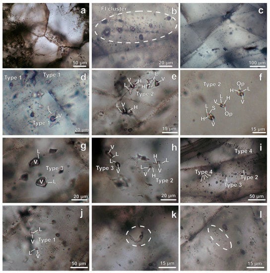 - Bodnar, R.J. Introduction to fluid inclusions. In Fluid Inclusions: Analysis and Interpretation; Samson, I.M., Anderson, A.J., Marshall, D.D., Eds.; Society for Sedimentary Geology: Broken Arrow, OK, USA, 2003; Volume 32, pp. 1–8. [Google Scholar]