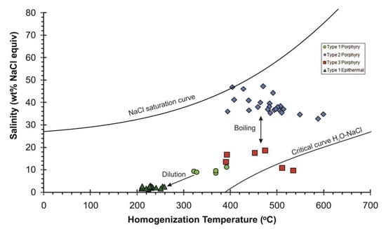 - Rusk, B.G.; Reed, M.H.; Dilles, J.H. Fluid inclusion evidence for magmatic-hydrothermal fluid evolution in the porphyry copper-molybdenum deposit at Butte, Montana. Econ. Geol. 2008, 103, 307–334. [Google Scholar] [CrossRef]