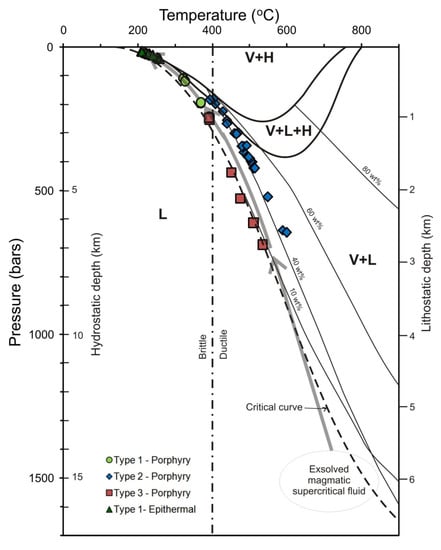 - Heinrich, C.A. The physical and chemical evolution of low-salinity magmatic fluids at the porphyry to epithermal transition: A thermodynamic study. Miner. Depos. 2005, 39, 864–889. [Google Scholar] [CrossRef]