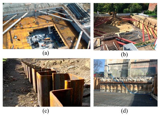 Various structural solutions for deep excavation support: (a) diaphragm wall, (b) Berliner wall (lagging wall), (c) sheet pile wall, (d) retaining column wall made by jet grouting (developed by authors).