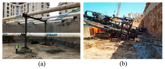 The measures of the displacements of buildings that are adjacent to the construction of deep excavations include tilts, deflections, and cracks of structural elements []. The value of the vertical displacements of the terrain surface and the shape of the settling basin depend primarily on the type of used excavation casing and the type of ground foundation. The range of impact of the excavations depends on the deformability of the soil, the depth of the excavations, the dimensions of the plan of the excavations, the possible presence of groundwater and the stiffness of the excavation casing. The scopes of the applied construction protections are different and depend on a specific situation [,,]. The most common external protections are in the form of a diaphragm wall, i.e., a Berliner wall (lagging wall), a sheet pile wall, and a retaining column wall made by jet grouting and mixed technologies (Figure 1). The stability of deep excavation casing made with one of these technologies is additionally ensured by bracing struts, ground anchors (Figure 2), or the floor slabs of underground storeys []. If there are relatively small spans, the bracing struts can be made of wide-flange I-sections. Larger spans require bracing that uses steel tubes with a diameter of 400–800 mm []. In addition to the compressive forces and the bending moment derived from excavation support load, very large impact on the axial forces comes from the thermal effects. In order to determine the real effect of temperature on the bracing strut, the susceptibility of their props needs to be determined.