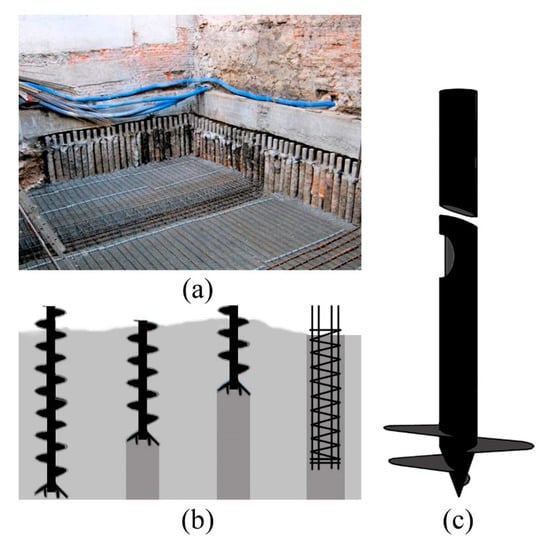 Additional structural elements that are used to transfer loads from the deeper layers of soil with a higher load-bearing capacity: (a) injection micro-piles, (b) drill micro-piles, (c) screw micro-piles (developed by authors).