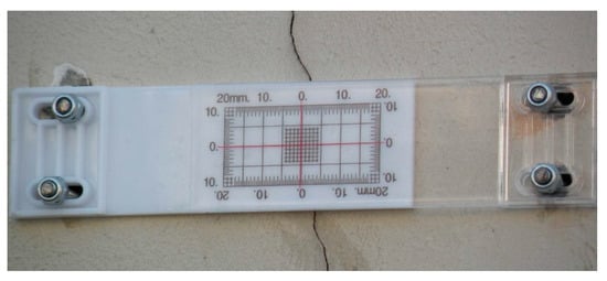 Monitoring of the technical condition of existing buildings is the most important element when controlling construction works and ensuring the safety of these objects [,]. The scope of observation of the structures of existing buildings depends on their location and the distance from a new investment. It usually includes the geodetic measurements of horizontal and vertical displacements for walls in the direct vicinity of the executed excavation, building observation, and possibly the measuring of the width of existing cracks with feeler gauges. An exemplary instrument for measuring the width of cracks is shown below in Figure 5. Other less frequently used monitoring methods are strain gauge, which measures deformation using foil strain gauges, and piezometric which is installed to control groundwater levels.